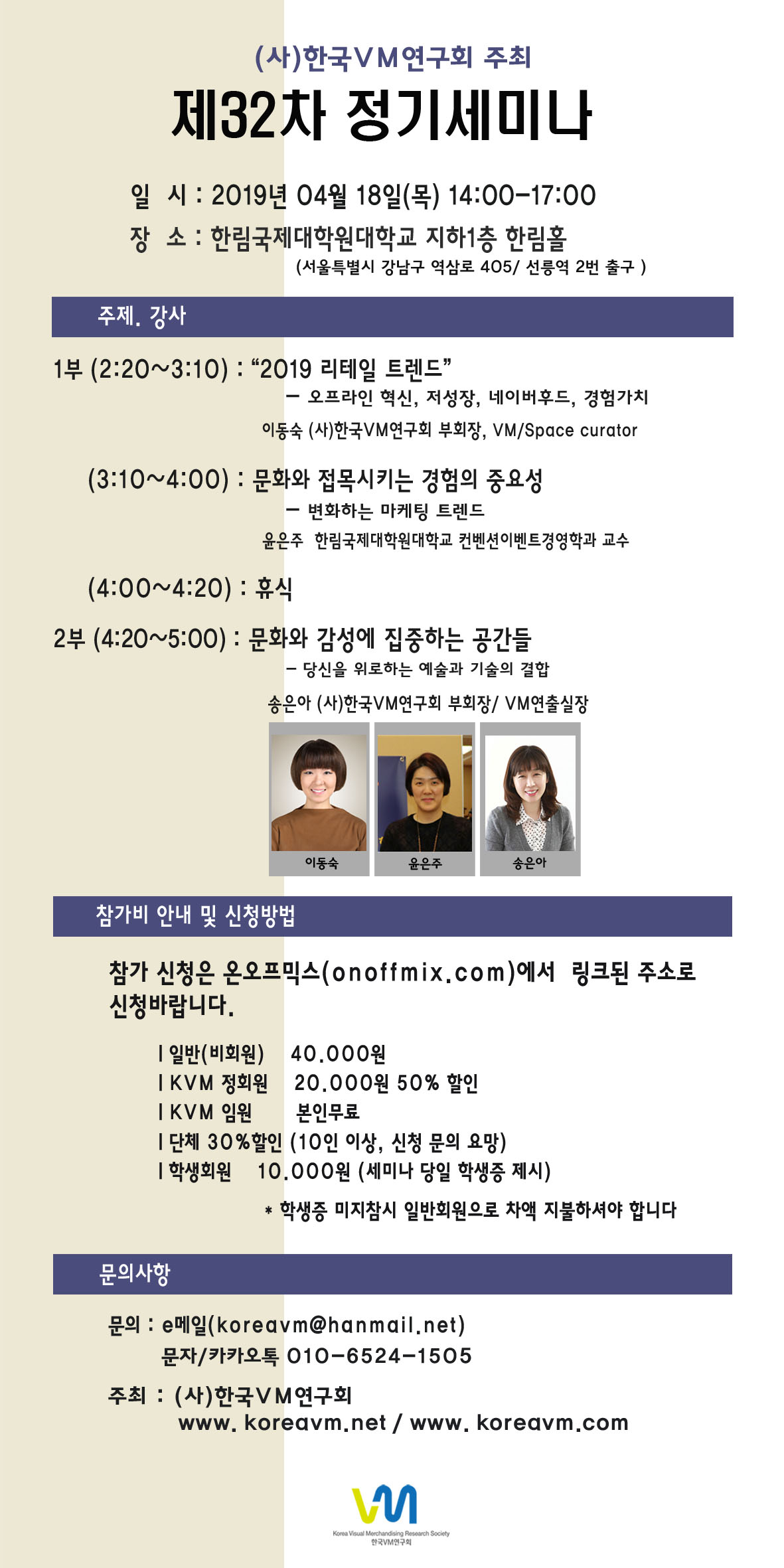 늦은 나이에 홍익대학교 산업미술대학원에 입학하여 석사과정을 하고 있습니다. 공부로 시간 여유가 안 되어 블로그 운영에 어려움이 있었답니다. 또한 세미나 준비까지 있어 더욱 난감하게 되었는데요. 우선 4월 18일 (사)한국VM연구회 제 32차 정기 세미나를 공지하고 앞으로 적극적인 포스팅을 하려고 합니다.