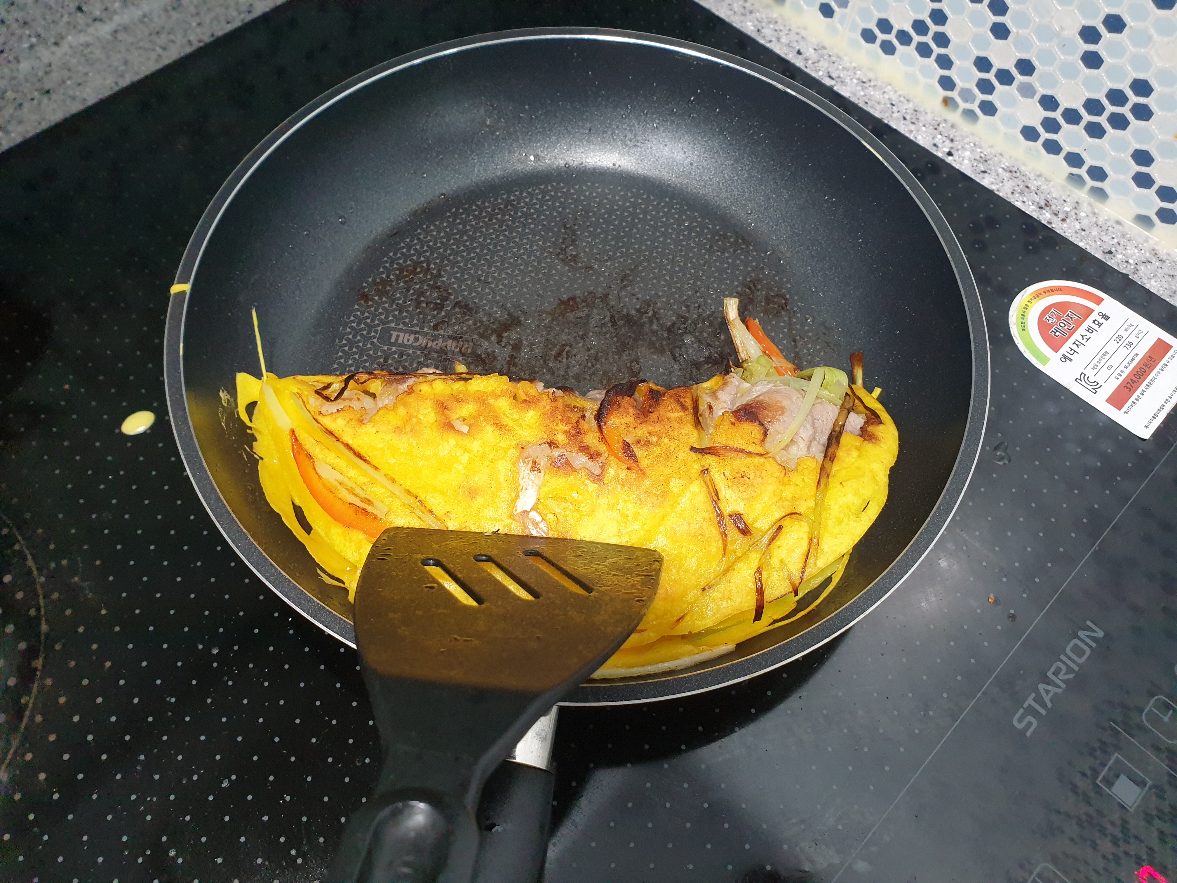 4. 볶은 재료 위에 반쎄오 반죽물을 얇게 펴준 후 올리브오일을 테두리에 넉넉하게 뿌려준다.