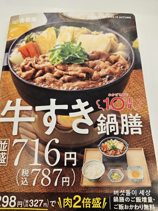 힐즈 바로 앞에 요시노야 매장도 있어 냉큼 달려갔습니다. 지난번 장어덮밥을 먹을 때 현지인들이 가장 많이 주문한 메뉴가 바로 소고기 전골이라는 것을 현장에서 목격한 후 저도 바로 소고기 전골을 주문해봤습니다. 아마도 10주년 기념으로 나온 메뉴인 듯 합니다.
