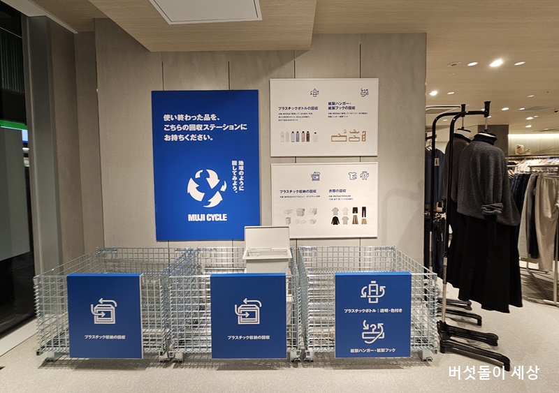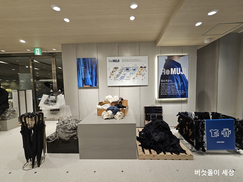 신주쿠 야스쿠니 거리점에서 가장 큰 특징은 리뉴얼을 통해 내장은 화이트 오크나 리사이클 알루미늄, 리사이클 타일 등을 사용했으며, 리뉴얼에서 나오는 폐기물은 가능한 리유스 하는 등 쓰레기를 내지 않는 리뉴얼로 지속 가능한 기업 이미지를 보여주기 설계였다는 점이다. 그 외 매장 내에서는 ‘MUJL CYCLE(리사이클 회수 센터)’를 설치해 고객으로부터 불필요해진 플라스틱 상품이나 의복을 점포에 회수해, 원료, 리사이클 상품으로서 활용해 자원이 앞으로 순환해 가도록 실천해나가는 점포로 변모하기도 했다. 실제로 매장 내에서 리사이클 공간들이 배치되고 있었고, 리사이클한 의류 등 자원이 순화되는 상품을 소개하는 플랫폼 역할도 보여주고 있었다. ‘ReMUJI(리무지)’ 코너도 회수한 옷을 재사용하고 새로운 가치관을 가진 아이템으로 다시 태어나도록 하여 ‘다시 염색한 옷‘, ’옷을 해체하고 연결하는 옷‘, ’씻은 옷‘ 등으로 재탄생한다.