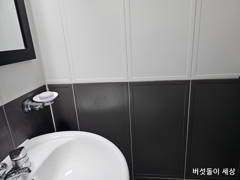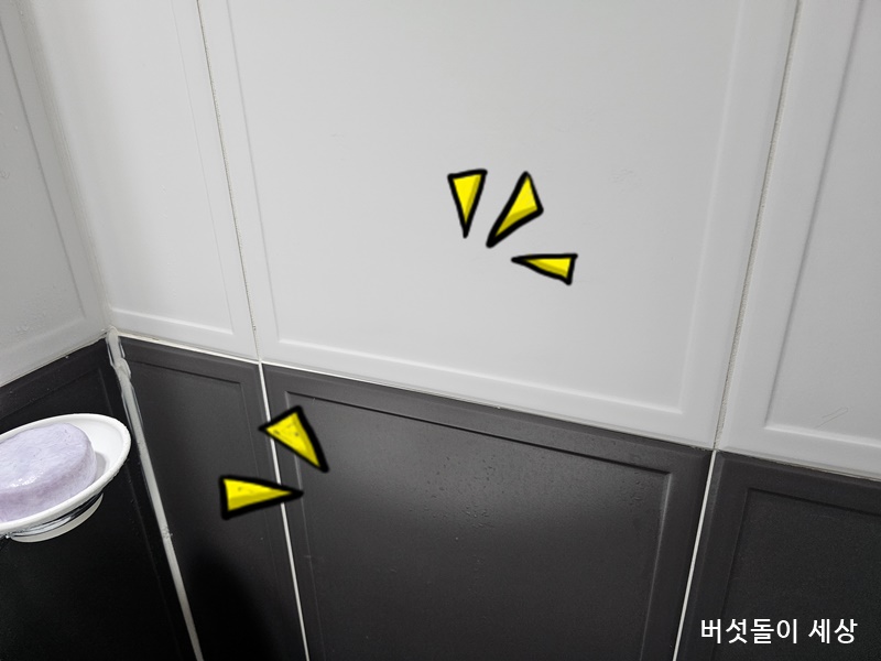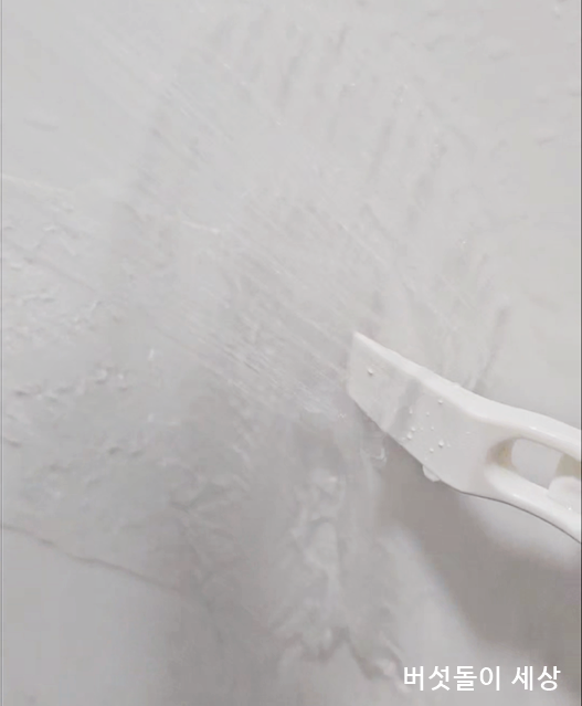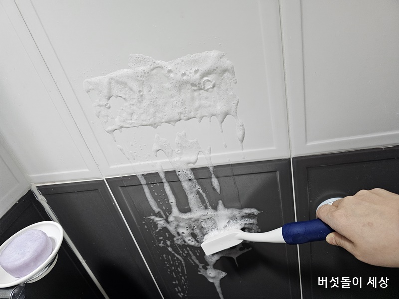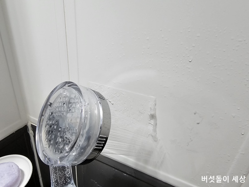 필름지를 제거했다고 끝난 것이 아니다. 더 강력한 제거 기술이 필요하다. 각종 도구를 활용해도 너무 강력한 접착력으로 쉽지 않다. 우선 접착력을 완화할 수 있도록 욕실 세정제를 고루 뿌려준다. 10분 정도 지난 후 뜨거운 온수로 샤워시키면서 틈새 청소도구로 박박 밀어주면 신기하게도 쉽게 제거되는 것이 아닌가!!!