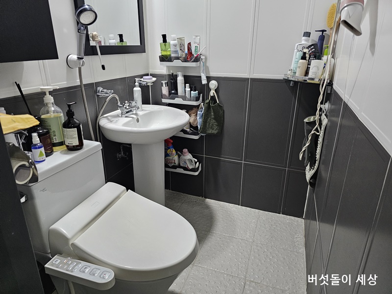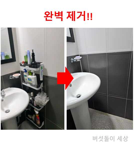 이사를 결정한 후 집안 곳곳 흠집이나 원상복구를 해야 하는 부분을 체크했다. 커튼 못 자국은 보수제를 활용해 메꾸니 자연스럽게 복구되었다. 하지만 전혀 예상치 못한 부분이 있으니 바로 욕실 벽면에 붙은 강력 테이프로 설치한 선반 4개이다.