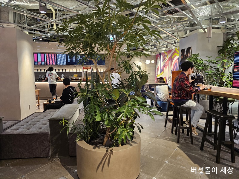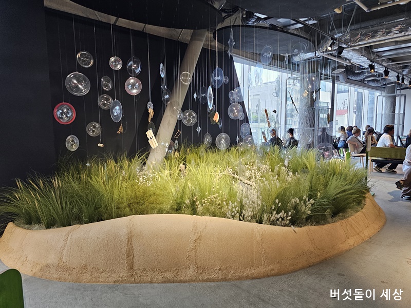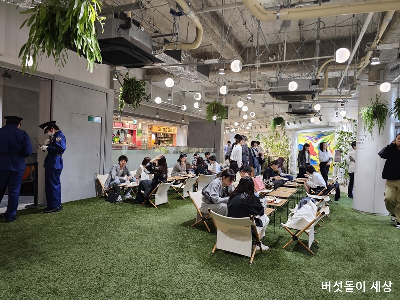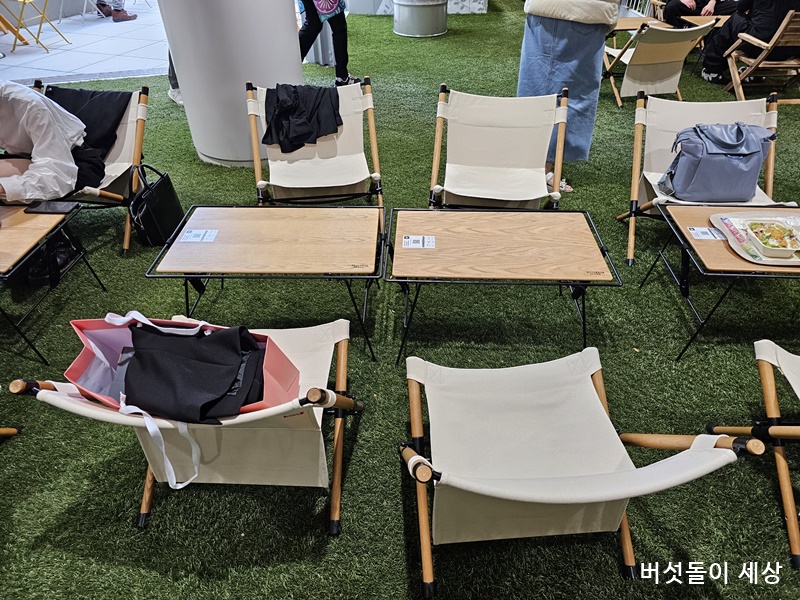 F&B 공간들은 인테리어도 독특하고 분위기도 뒷골목 컨셉이라 느긋하게 식사를 즐기고 싶은 공간과 매장들로 구성했어요. 특히 6층은 잔디존으로 구성되어 마치 캠핑공간에서 식사와 차를 마시는 분위기를 자아냅니다.