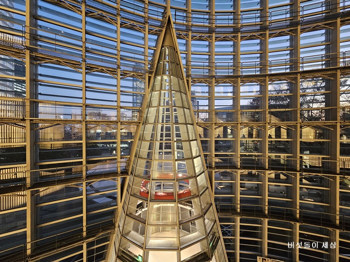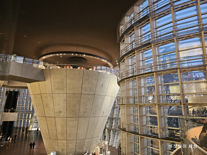 이 유리는 자연광을 실내 깊숙이 끌어들이면서도 자외선과 일사열은 차단한다. 면진 구조, 자연 환기, 빗물 재활용 등 친환경 설계 역시 ‘자연과의 공생’이라는 건축가의 철학을 보여준다. 낮에는 태양빛으로 건물이 빛나고, 밤에는 실내 조명이 외부로 퍼져 도시를 밝히는 하나의 거대한 조명이 된다.
