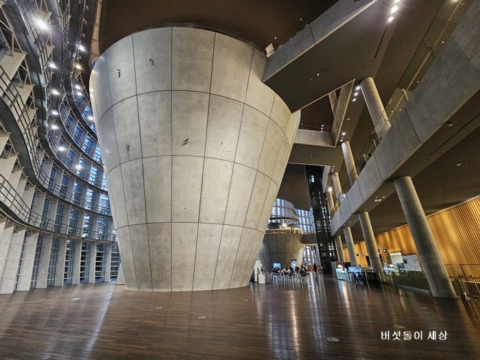 미술관 내부에 들어서면 가장 먼저 원추형과 역원추형 콘크리트 구조물이 시선을 사로잡는다. 마치 건물 안에 또 다른 건물이 박혀 있는 듯한 인상이다. 수평적으로 안정된 공간 속에서 수직으로 솟은 이 구조물은 공간에 강한 긴장감을 만든다.